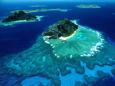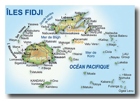 Les Fidji se composent de 322 îles, dont environ un tiers sont habitées. Les deux îles les plus importantes sont Viti Levu et Vanua Levu. Viti Levu accueille la capitale Suva et presque les trois quarts de la population y habite. D'autres villes importantes sont Savusavu et Lautoka. L'aéroport international principal est situé à Nadi (prononcé Nandi), du côté occidental de Viti Levu, à l'opposé de Suva.